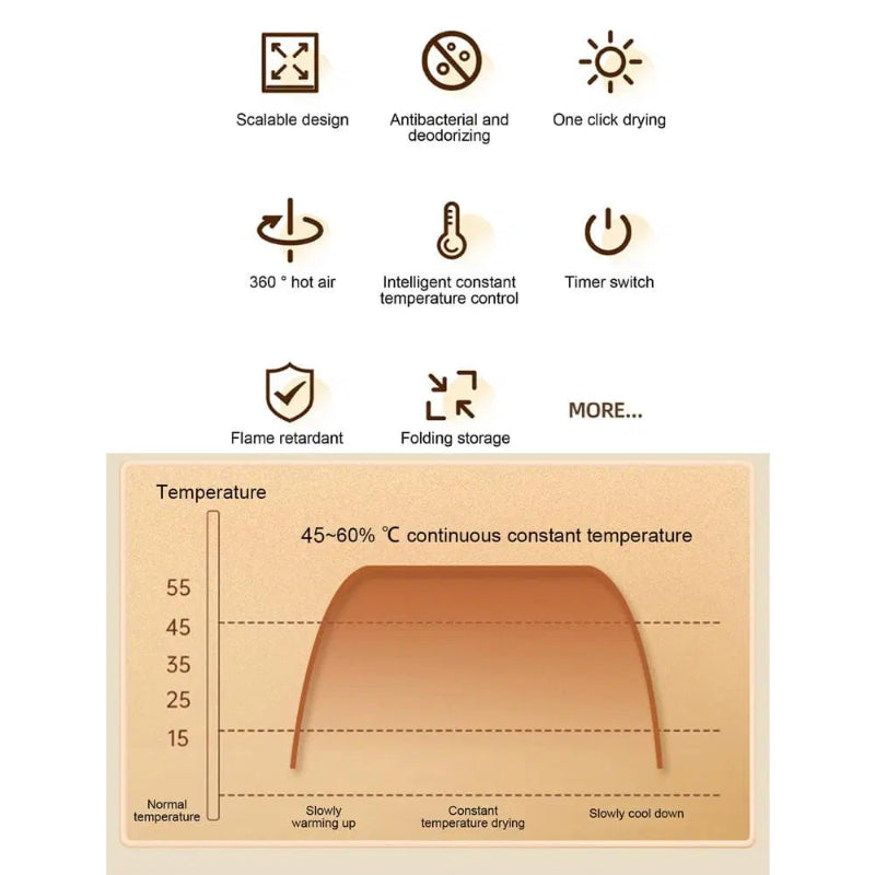 Grazie alla sua tecnologia di circolazione dell'aria calda, questo asciuga scarpe ti garantisce piedi asciutti ogni mattina, anche dopo una giornata di pioggia. Finiti l'umidità stagnante e i batteri!
